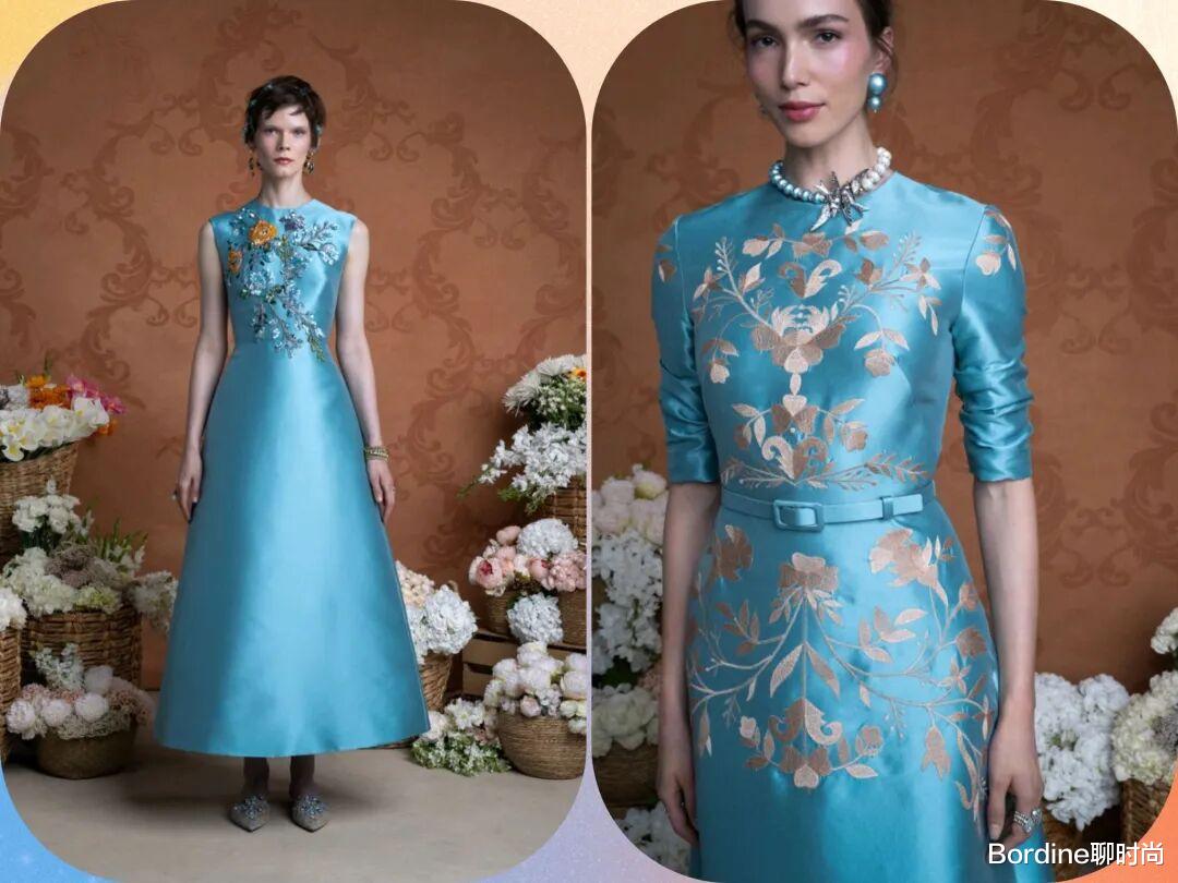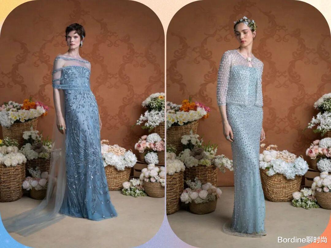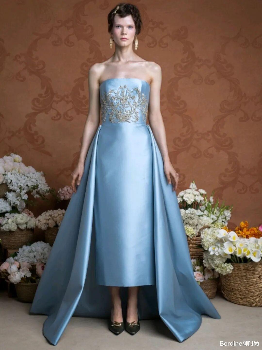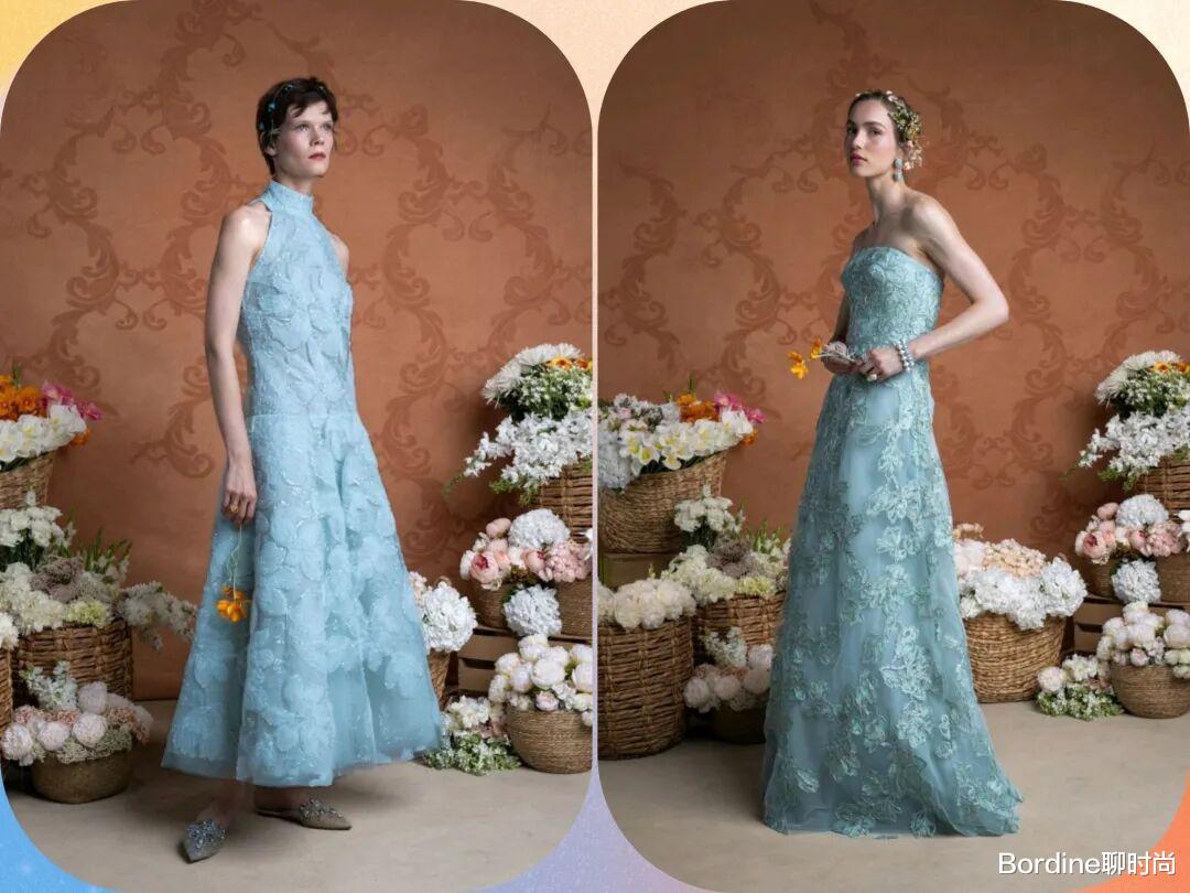 蓝色系的颜色在清冷的色调中多了清新的气质,以轻薄的薄纱材质结合了立体的花纹图案,为裙装增加了不少的质感纹理,优雅也更有浪漫时尚的细节感。