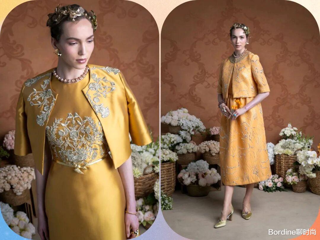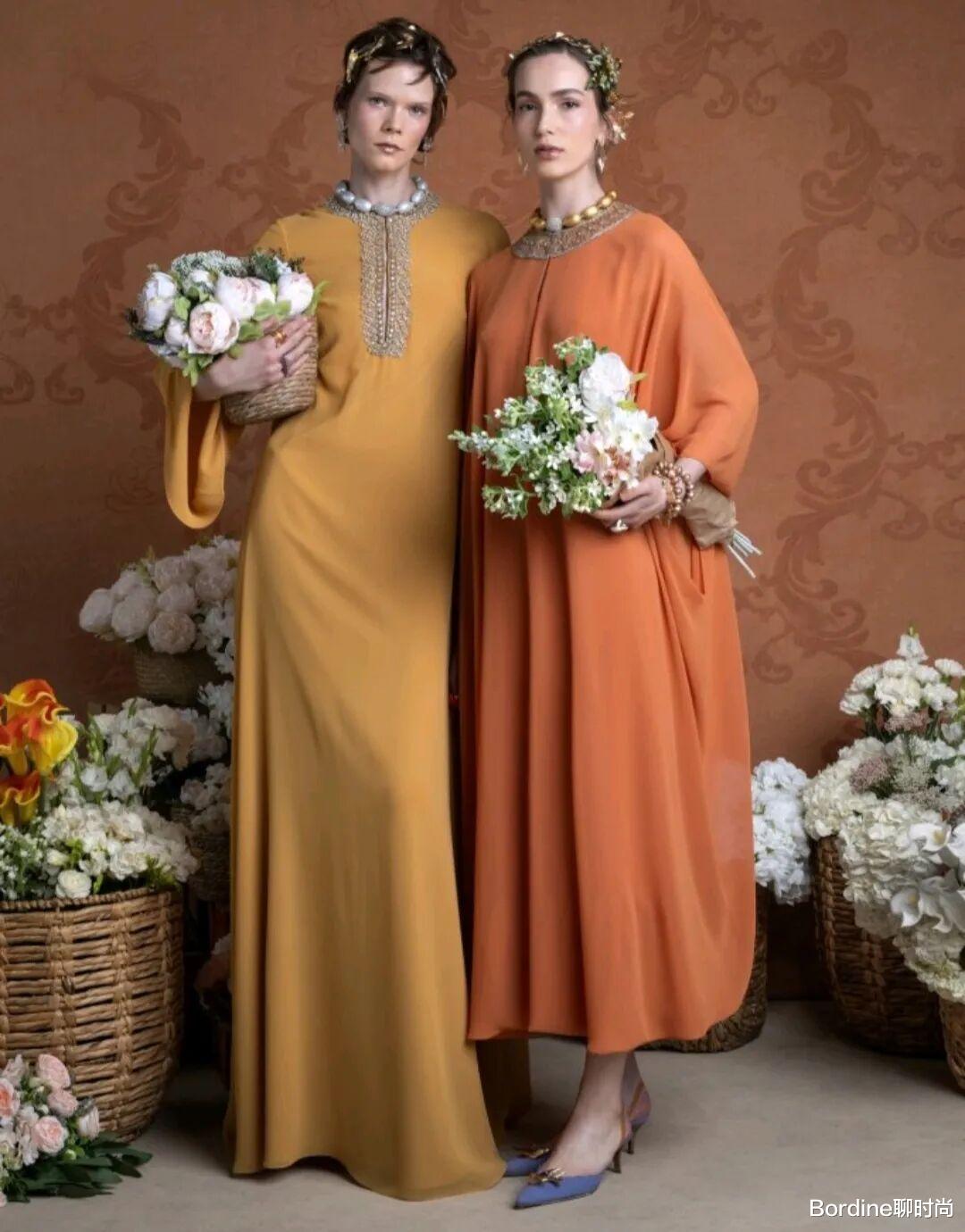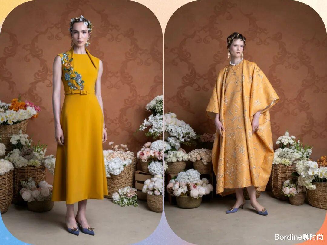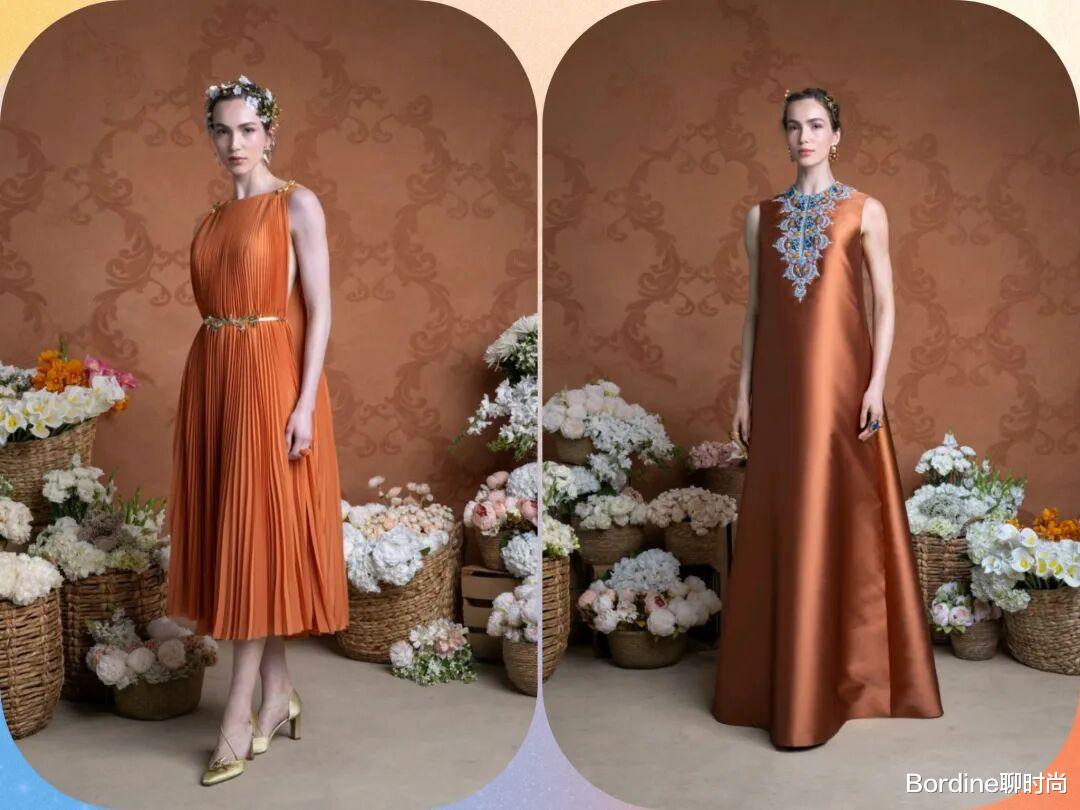 橙黄色的颜色带着更多的温暖和能量感,在优雅的裙装中,结合了褶皱元素、斗篷廓形等设计,在图案的装饰中,优雅高级也多了活力气质。