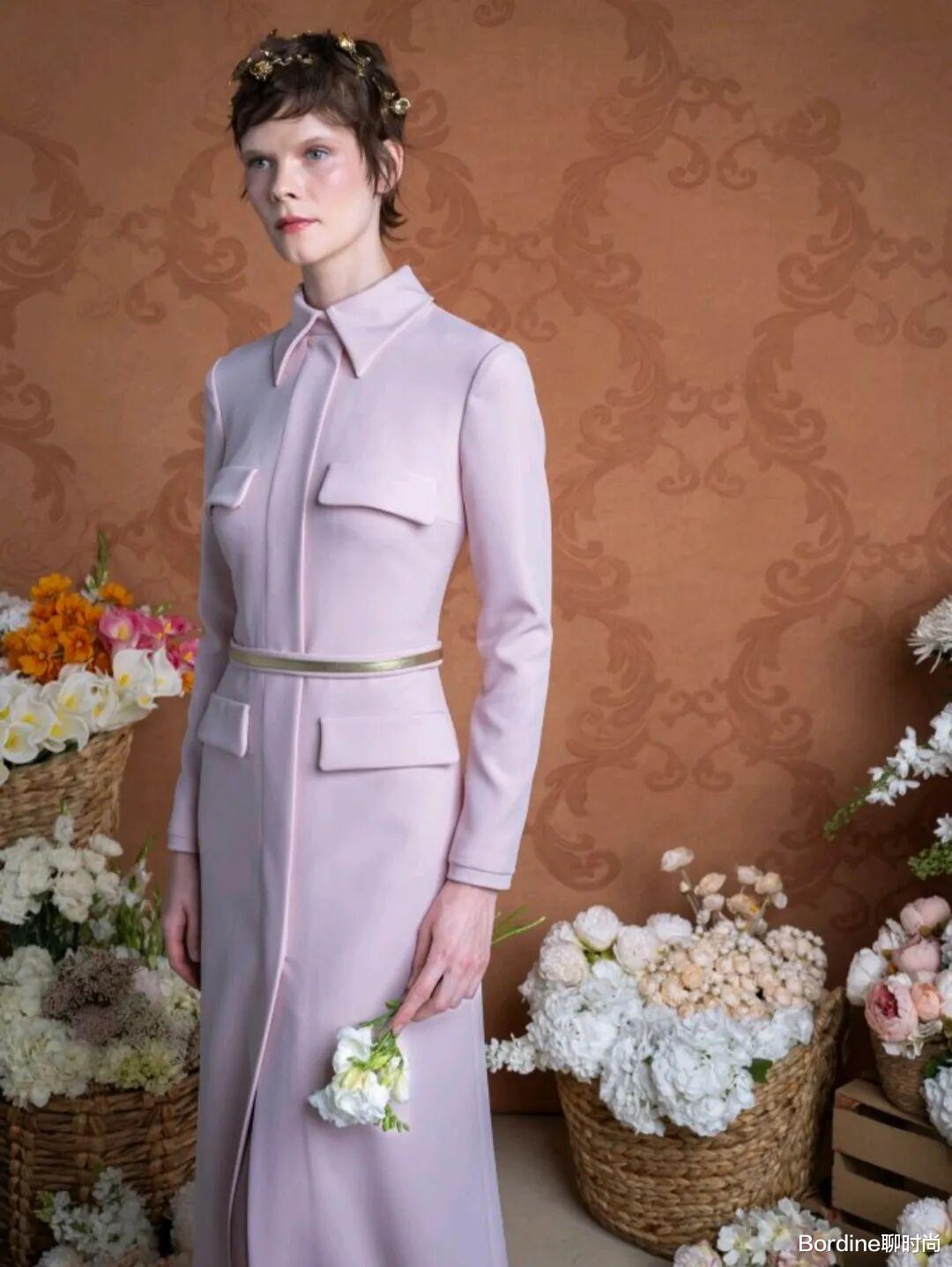 浅粉色的裙装在浅淡的色调中,柔和的颜色还有不少甜美粉嫩的少女感气质,修身的柔和增加了温婉优雅的气质,还在口袋盖的装饰中增加了细节亮点,而金色系的腰带的装饰,也更增加了一些高级时尚。