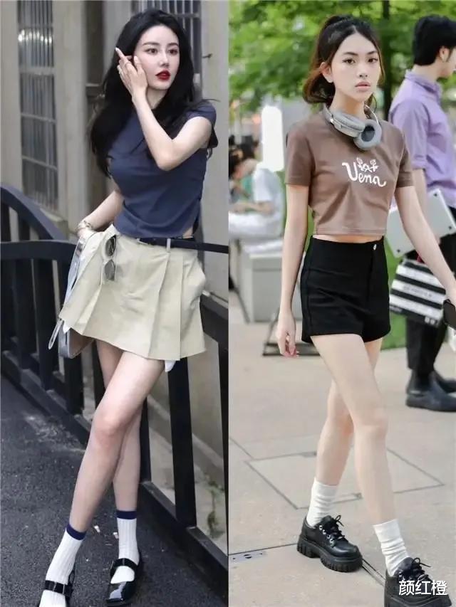 如果你确实拥有修长笔直的美腿,想要把它呈现出来,建议选择右边的这1套穿法,用短袖上衣搭配上百慕大短裤,穿的时候把T恤的一角塞进裤子里面,再勒上一个小腰带,能提升腰线,而且百慕大短裤比较挺阔有型,穿在身上之后也很干练,非常适合咱们普通大众女性尝试。
