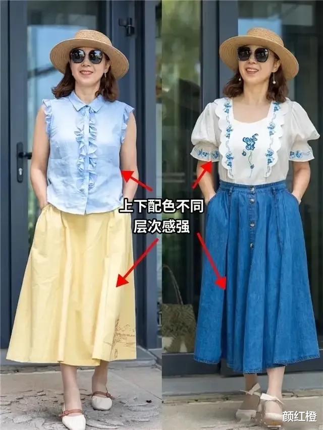 有的时候我们还可以采用装饰的搭配技巧,让造型更加有层次感,比如用浅蓝色的衬衫上衣搭配上黄色的半身裙,你眼看上去就能分出你的腰线位置是在哪里,这也是撞色搭配的魅力所在。
