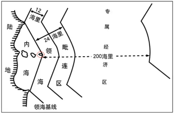 领海基线是沿海国家测算领海宽度的起算线。可能很多人不太理解,领海不就是从陆地海岸线开始算吗,起算线不就是海岸线?如果陆地是一条直线,且外面没有岛屿,那确实是这样。但海岸线是曲折的,基点之间连线会到海面上;海上还经常有岛屿,如果距离小于12海里,那么岛屿变成一个领海基点(下图红色圈内小岛),连线更是很多都在海上。领海基点之间的连线,就是领海基线。基线内向陆地一侧的水域称为内水,向海的一侧依次是领海、毗邻区、专属经济区、大陆架等管辖海域。