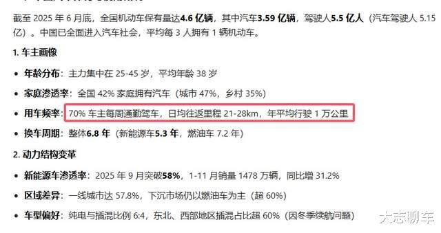 我看过一份叫做《中国车主用车环境报告》里面,截至到2025年的6月份,我国汽车保有量达到4.6亿辆,但重点是数据里面说了用车频率,70% 车主每周通勤驾车,日均往返里程21-28km,年平均行驶1万公里,也就是说,一天也就28公里的行驶里程,再加上充电桩的普及度也已经非常大了,这时候,固态电池的长续航能力,实际上优势也并不明显。