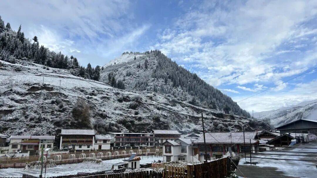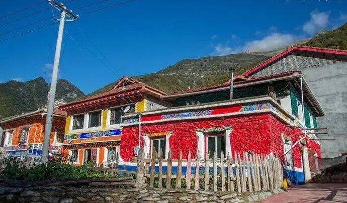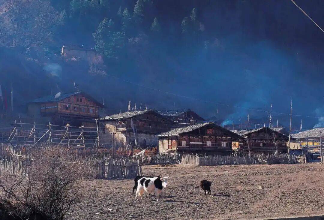 几十栋藏式民居错落有致,沿着山势自然散开,没有任何刻意雕饰,只有风声、鸟鸣和溪水声。