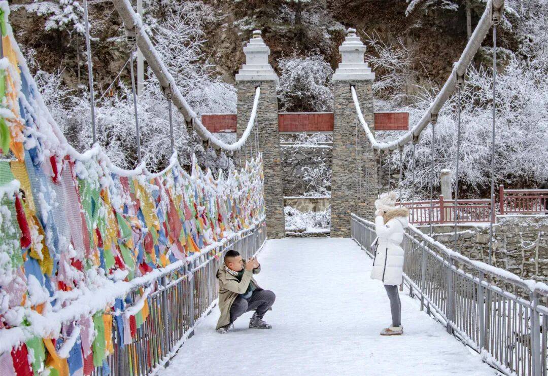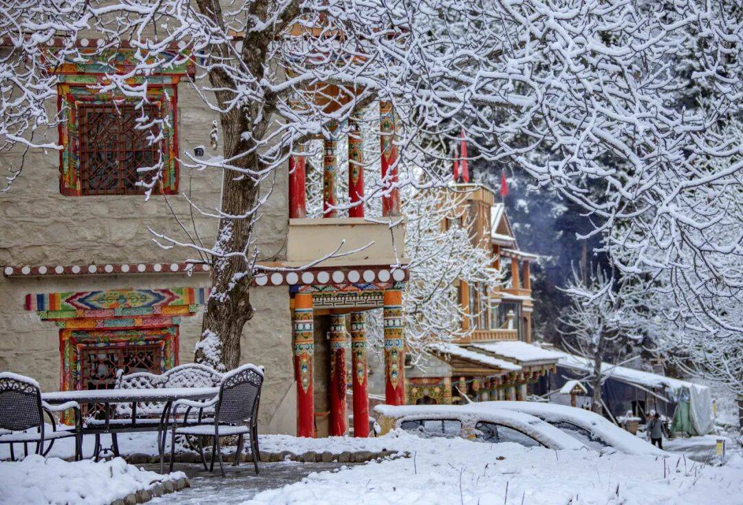 冬日里,屋顶覆雪,小河欢腾,光毫无遮挡地洒满全身,找个地方坐下,让雪山下的宁静把心里的褶皱都熨平~