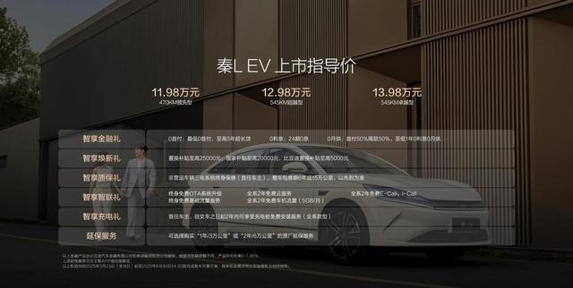 秦L EV在2025年3月23日正式上市,它的出现就像是一颗璀璨的新星,在汽车市场中闪耀着独特的光芒。这款车一共推出了三款配置,价格在11.98万元 - 13.98万元之间,这个价位对于很多家庭来说,是比较容易接受的。