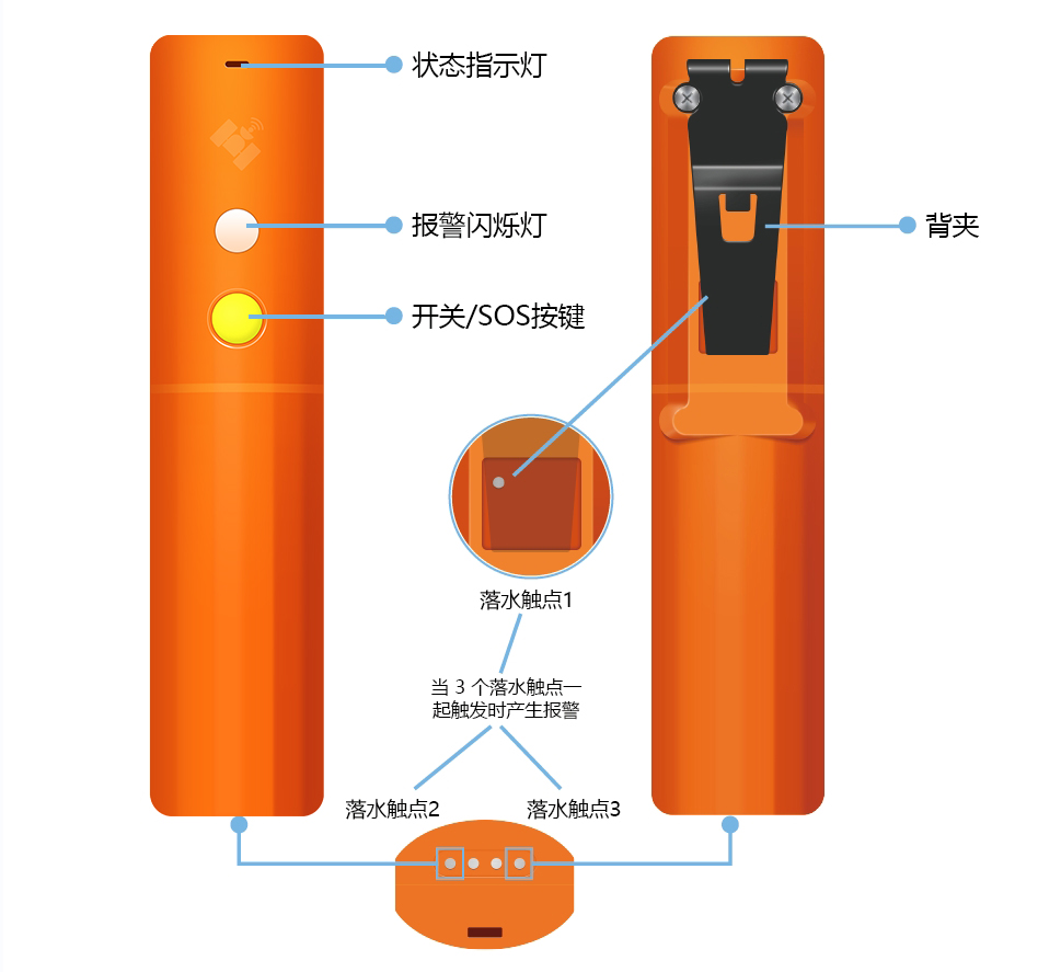 8、落水报警功能:具有落水检测,自动开机,自动报警;