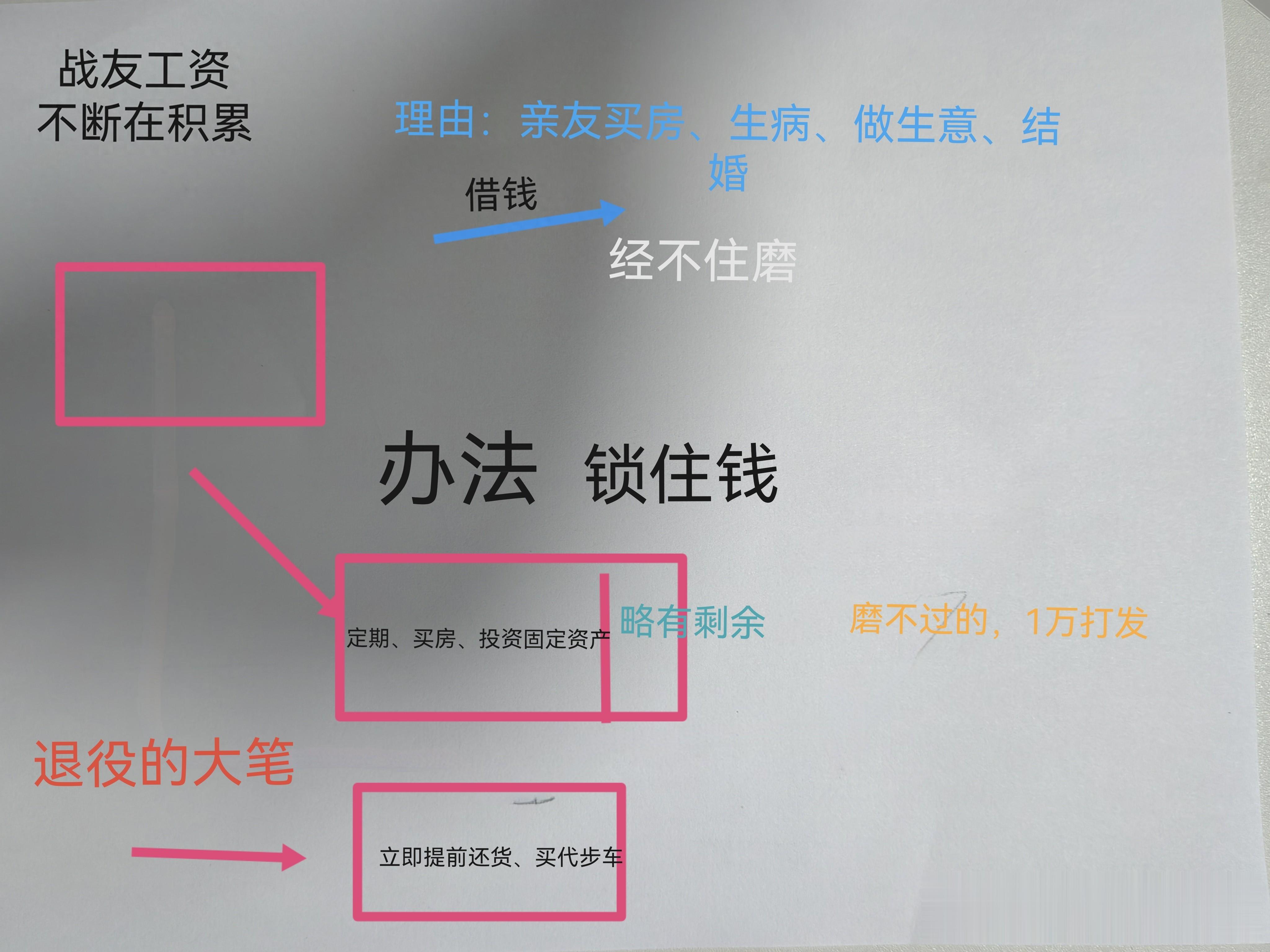 退役的战友,回来第一件事情就是锁钱,可以提前还房贷,就不用月供了,毕竟收入会减少,该买车就买车。锁住钱了,套路就少了。
