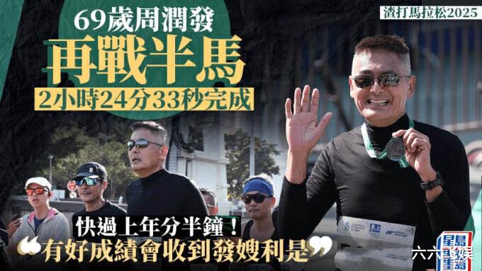 近日,69岁的周润发以2小时24的成绩完成了2025年渣打马拉松的半马比赛。虽然他觉得当天的天气很适宜,但也表示这不是他的最佳成绩。他希望明年能用2小时20分完成半马,到80岁的时候,能在2小时内完成。