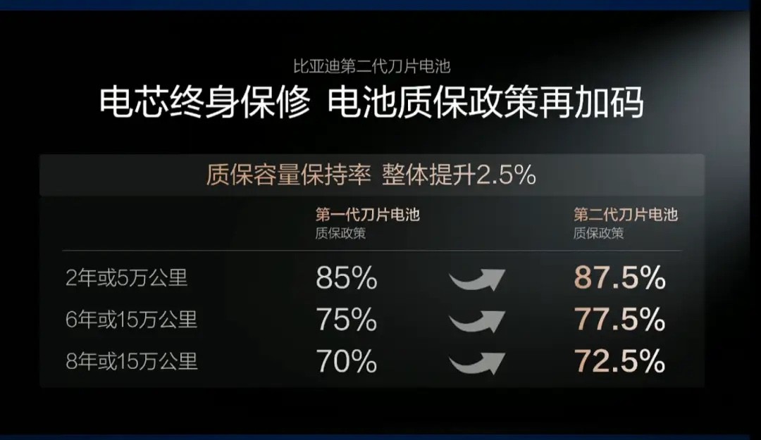 怎么证明?相比第一代刀片电池的质保政策,比亚迪直接把二代刀片电池的质保标准提升了2.5个百分点,电芯终身保修。而这,是一种技术绝对自信才敢豪掷的加码政策。