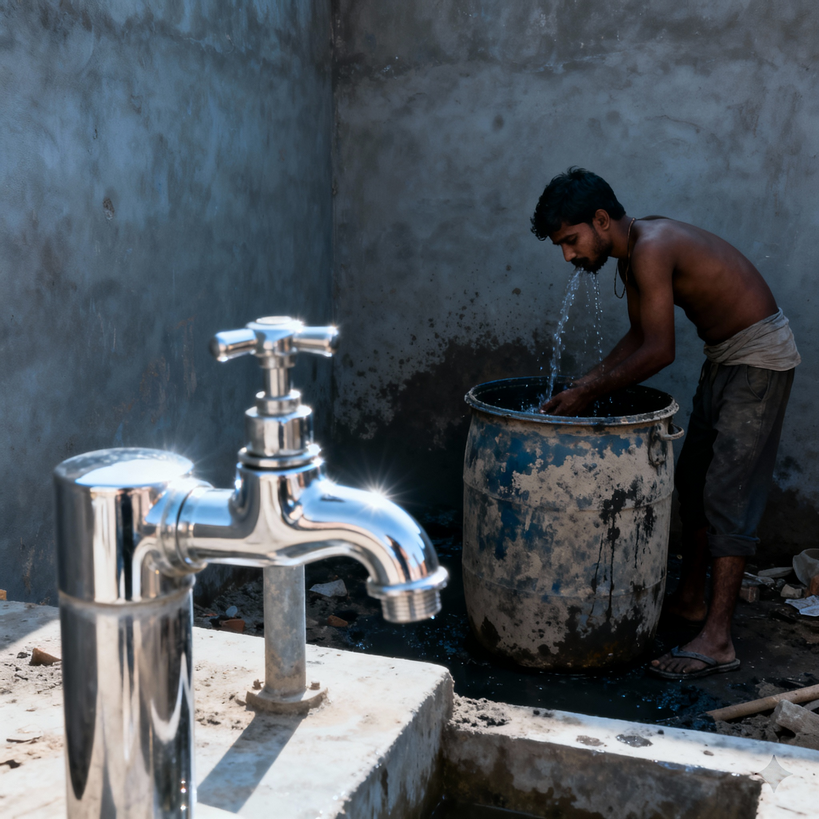 工地上有水龙头,可是Raju不会去用它,他和另外几个临时工有属于他们自己的水桶,这些水桶放在角落里,水要么是从附近的小摊位买的,要么就是他们自己在清晨提来的,上层种姓工人用的水龙头,他不能去碰,不是因为脏,而是因为“会被污染。这种“污染”,不是卫生概念,是秩序概念