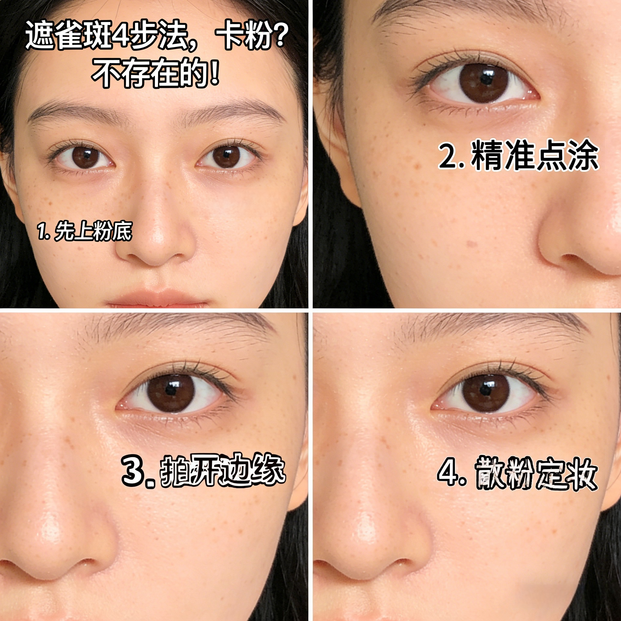 黑眼圈那种大片面积可以这么做,但雀斑是一粒一粒的,就得有点耐心。遮完一遍,凑近镜子看看,还有没有特别顽强的“钉子户”,再给它补一点。