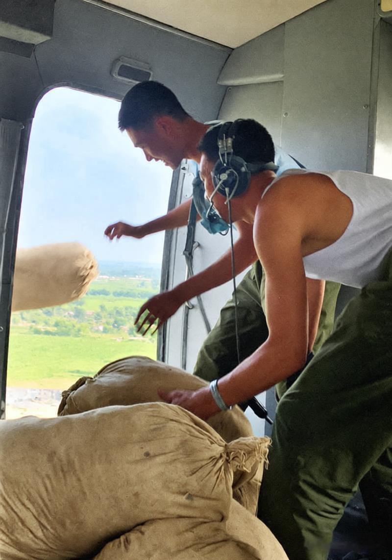 1976年,唐山地震期间,直升机空投救灾物资,局促的机舱内堆满鼓鼓的麻袋,两名解放军战士顾不上舱内颠簸——其中一人穿着背心、挂着通讯耳机,身体前倾稳住重心;另一人探向敞开的舱门,伸手将物资递向窗外,舱外是地震后一片狼藉的灾区地貌,零散的村落痕迹正等待着这些“空中送来的希望”。