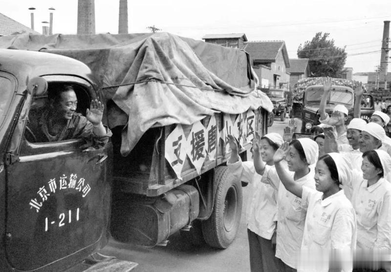 1976年8月1日,北京市运输公司的卡车车头旁,司机探出身笑着挥手,车厢篷布上“支援唐山”的大字格外醒目;车旁一群戴着白帽的女工,正是北京市第一食品厂的工人,纷纷抬手回应,这群工人正加班加点生产面包、饼干,这批物资即将运往刚经历地震的唐山灾区。