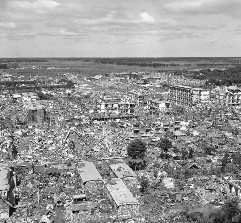 1976年7月28日,唐山地震后的航拍照片,带着直击人心的破碎感。从高空俯瞰,原本是工业重镇的唐山已彻底沦为废墟——密集的城市建筑几乎被夷为平地,高楼只剩断壁残垣,低矮民居坍成连片的瓦砾堆,废墟里仅零星立着几棵幸存的树木,地面上能看到几处临时搭起的简易棚,远处的开阔田野与眼前的城市残骸形成尖锐对比,连天空的云都衬得格外沉重。