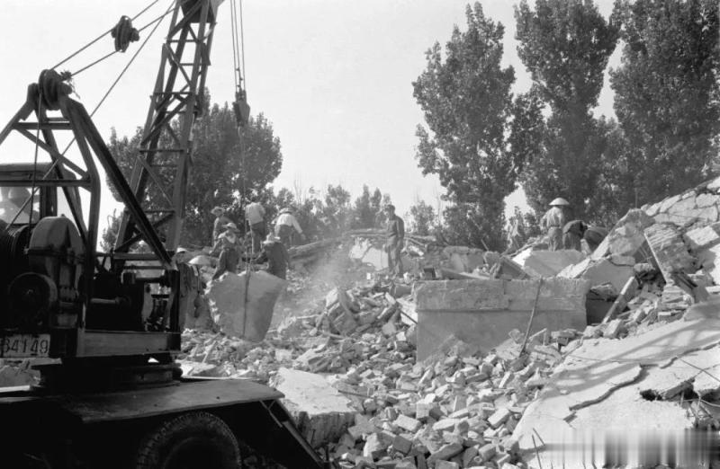 唐山矿业学院位于唐山震中核心区,这场7.8级强震的23秒毁灭性震动,让其砖混结构的宿舍楼瞬间垮塌,大量师生被埋压在废墟下。震后,解放军救援部队与学校教职工第一时间赶到现场:初期靠撬棍、铁锹等手工工具搜救幸存者,后续调来起重机等设备,既清理大型废墟构件拓宽作业空间,也避免重型机械误伤可能的被困者——这张照片里的作业,正是当时院校废墟救援的典型场景,而唐山矿业学院也是震中受损最严重的高校之一,不少师生在此次灾难中不幸遇难。