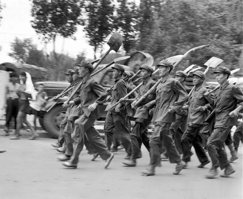 1976年,唐山地震后的黑白照一队解放军战士穿着略显褶皱的军装,每人肩上都扛着铁锹,步伐迈得又大又急,裤脚带起路面的尘土,能看出是刚下运输车辆,就立刻奔赴灾区核心区的状态,路边的群众或驻足让行、或投来目光,藏着震后的焦虑与对救援的期待。
