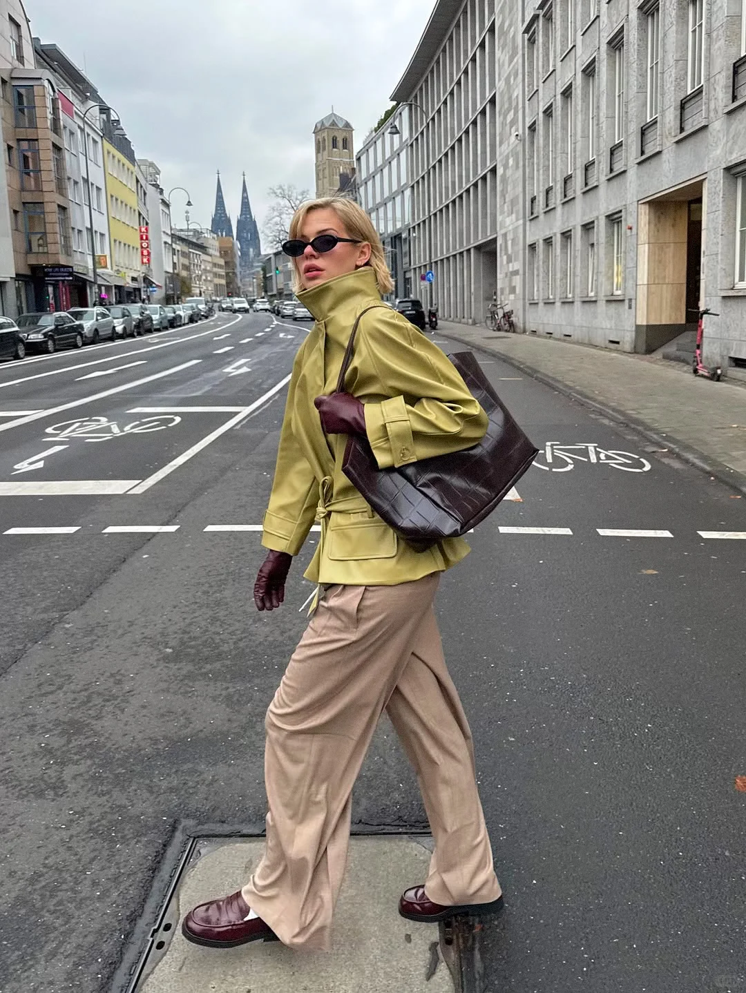 辣椒绿夹克、羽绒服搭配卡其色阔腿裤、蓝色牛仔裤,能自带焦点,美得张扬又高级,以独特的色彩张力打破路人感。