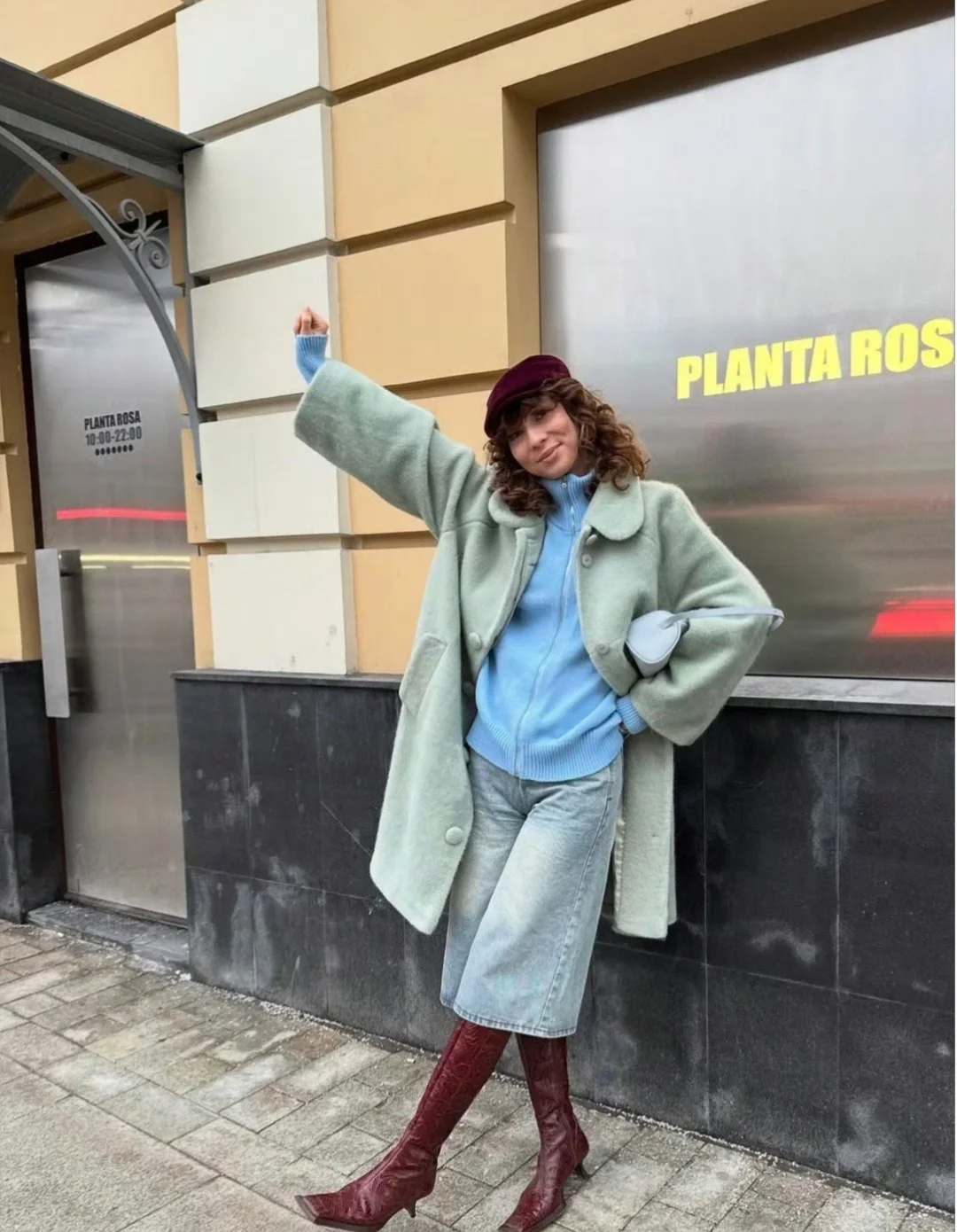 像这样浅薄荷绿在冬日穿,有一种季节反差感。可以配粉蜡色系单品,如浅蓝色、淡粉色、柔黄色等等。