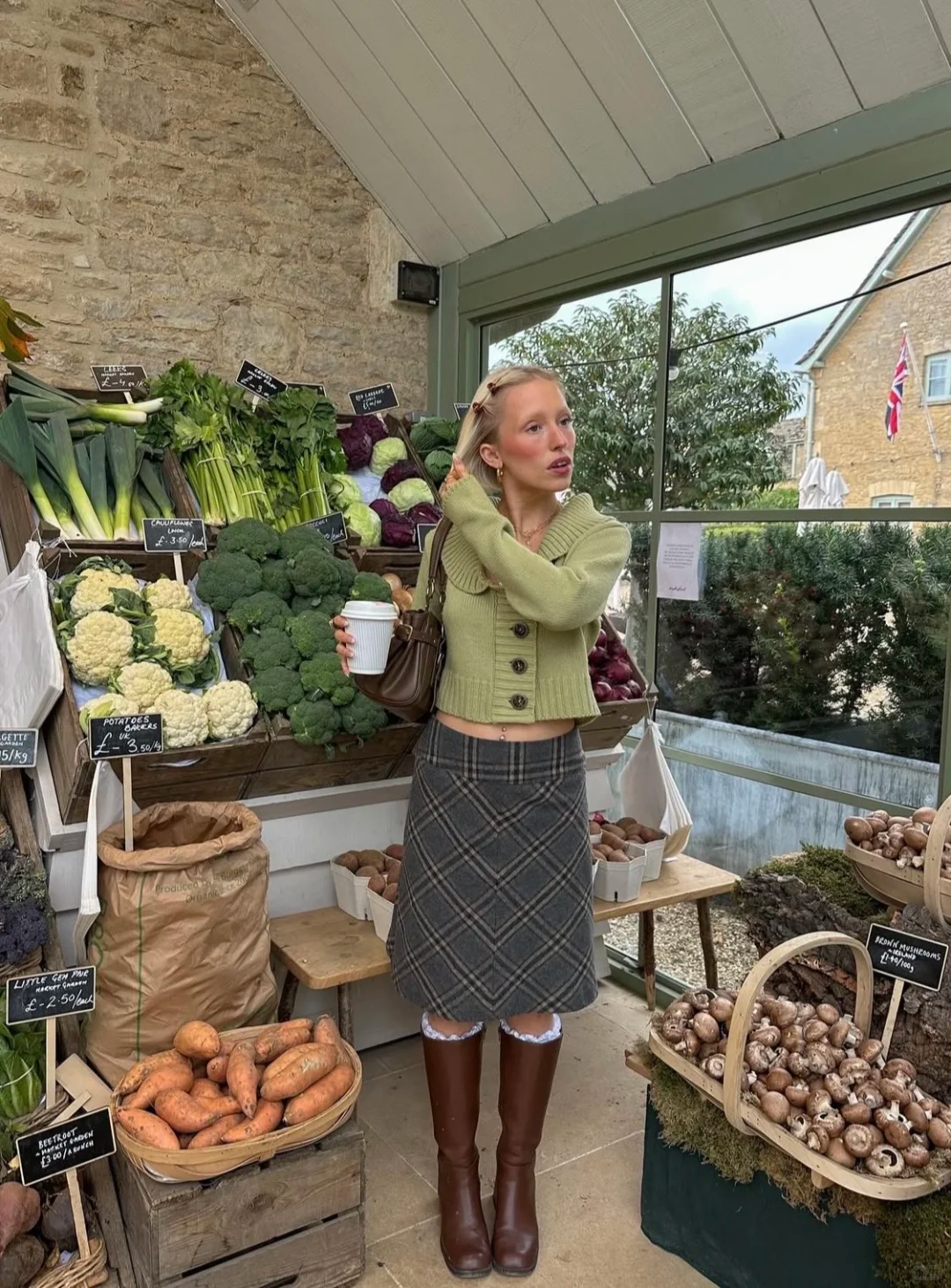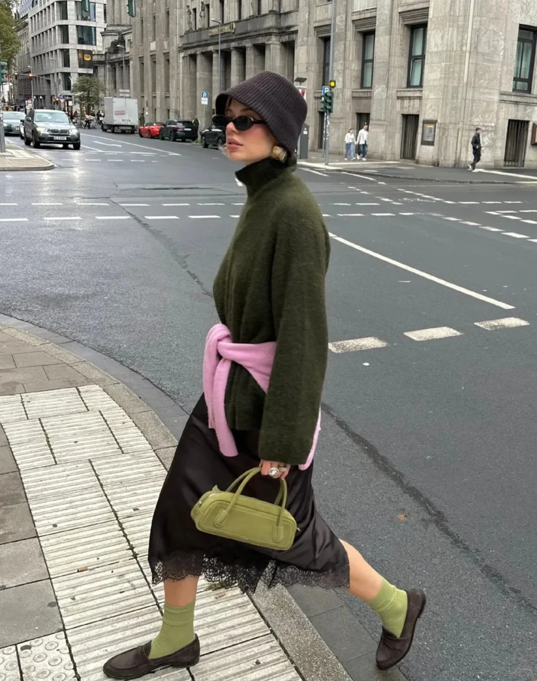 绿色毛衣、绿色夹克搭配深咖色真丝半裙,醇厚的咖色调宛如大地,稳稳承接住上半身的盎然绿意。彩色配件点缀,这一点明艳的“破局”,瞬间激活全身。