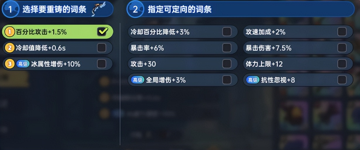 可选词条如下,我们优先选择---冷却值降低 0.6s、冰属性增伤10%、全局增伤 3%