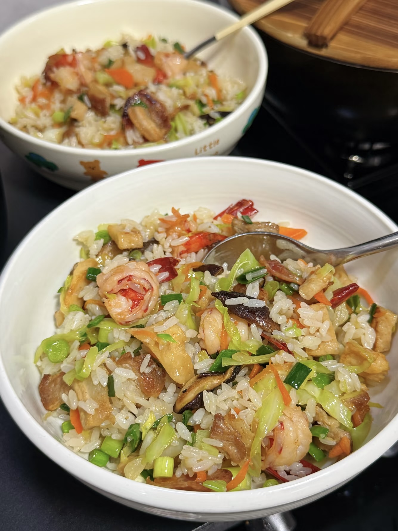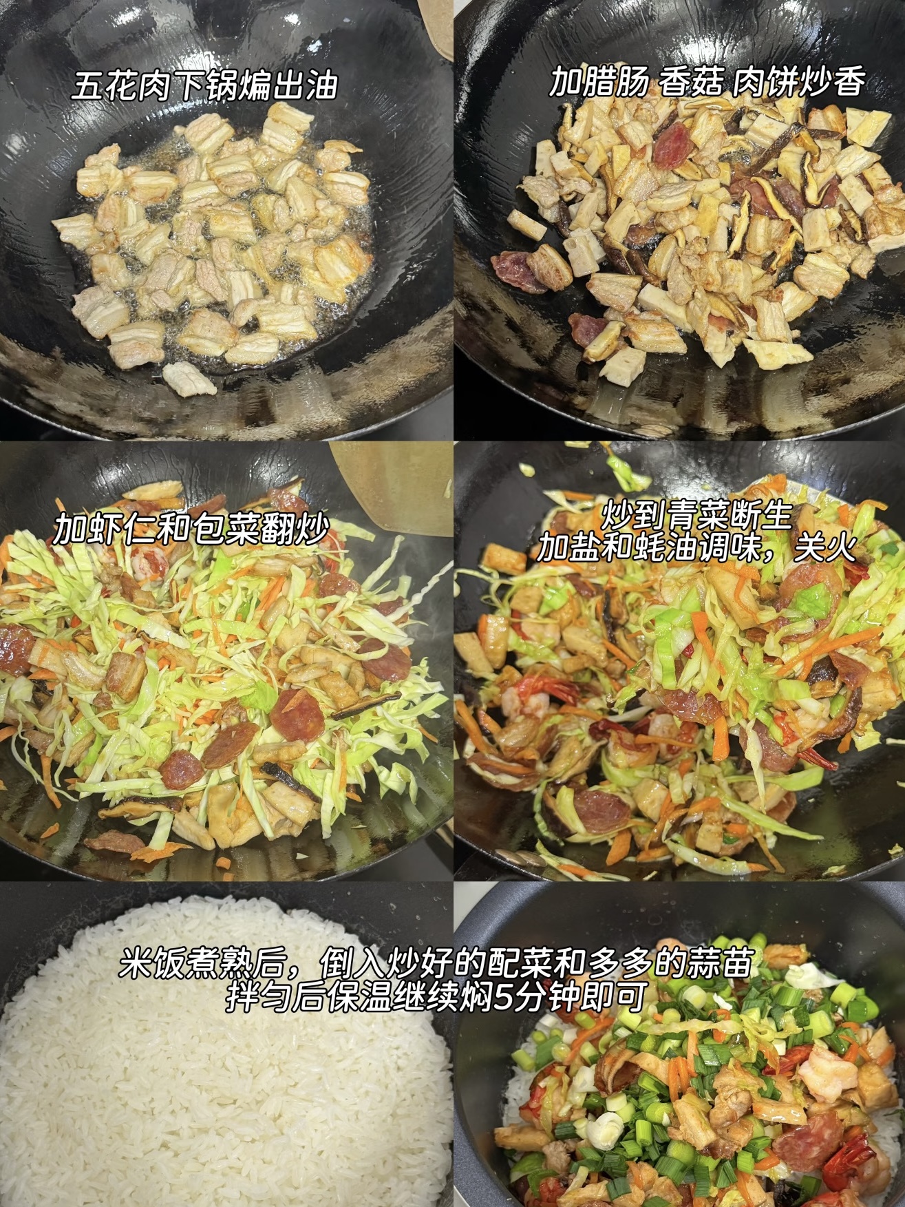 五花肉切薄片,冷锅小火慢慢煸,让油花“滋滋”往外冒,油渣金黄时推至一边,把腊肠丁、香菇丝、肉饼碎统统请下锅。腊肠受热“啪”地裂开,酒香瞬间蹿上屋顶;香菇吸饱猪油,嫩得像在口腔里滑滑梯。火调大,青菜、包菜、虾仁排队入场,锅铲翻飞三十秒,菜叶刚断生就关火,保留脆感。盐和蚝油压轴,咸鲜度一次到位,千万别手抖,后面可没机会补味。