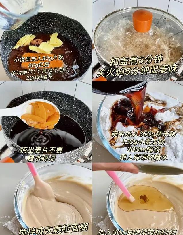 做这椰汁红糖年糕啊,食材乍一看没啥特别的,可凑一块儿,那就是“超级厉害的组合”!先说这糖水,80 克片糖、80 克红砂糖,再加 30 克姜片和 220 克清水。这姜片呢,不喜欢的宝子尽管去掉,不过听说加上会有不一样的味道哦。还有 350 克糯米粉、120 克淀粉、300 克椰浆和 30 克食用油。这些食材就像一群等着被召唤的“神奇小家伙”,单瞧着普普通通,一旦搅和到一块儿,就要在厨房里闹出个“大动静”,变出超美味的东西来!