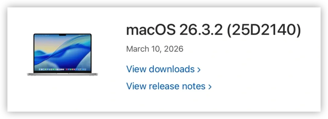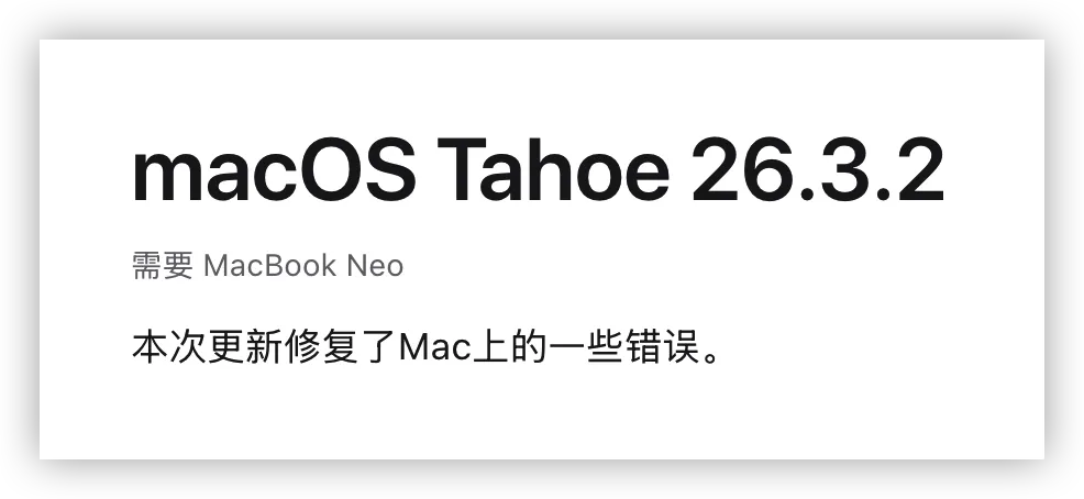 从日志标题的后缀可以看出,macOS 26.3.2 似乎仅面向 MacBook Neo 机型推出。