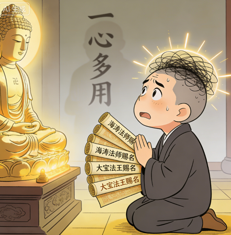 还有一些人呢,去到一个寺庙里就找个师父说:“师父啊,您给我起个法名吧。”今天见到海涛法师了,我要皈依海涛法师,海涛法师给我起了一个法名。非常棒!棒棒的!过了两天又见到大宝法王了,大宝法王层次极高,我请大宝法王再赐一个法名。过了几天又见到哪个寺庙的住持了,好嘞,我再皈依一次。想想自己老厉害了!这样子法名也越来越多,这时你发现你念经也不专心,念不到心里去,持咒也是杂念丛生,这个时候你就明白了,很多时候是自己的这个名把自己的神给分散了。分散之后你的各方面出现了以上的障碍。