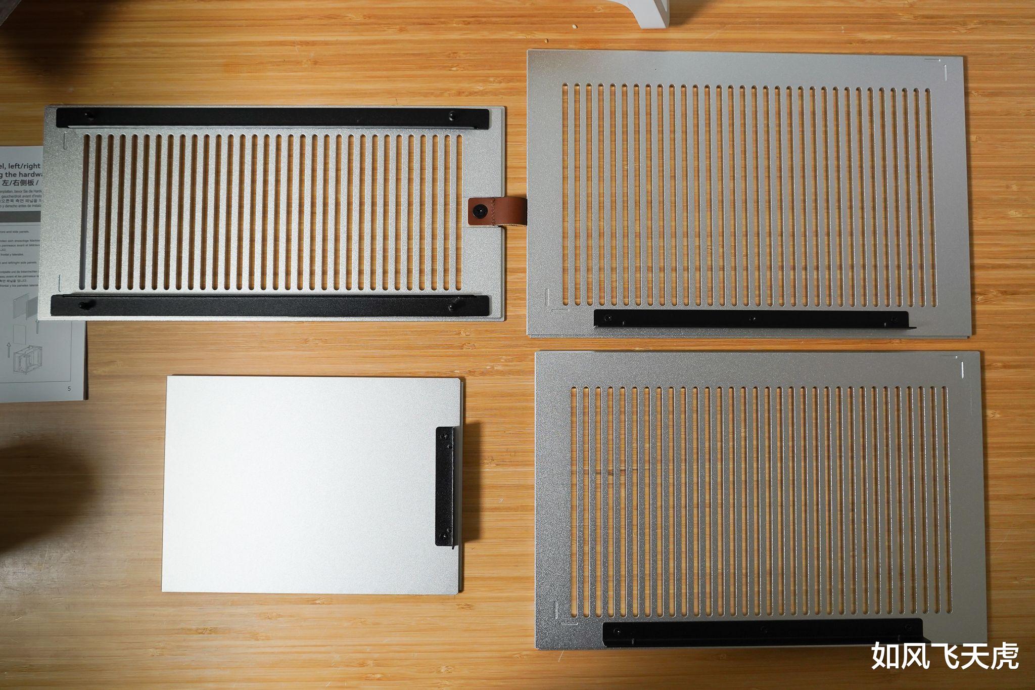 取出机箱,引人注目的就是这铝合金的材质。侧面、顶部都是铝合金的,厚度达4mm,铝合金喷砂阳极工艺,绽放出金属的细腻质感。三面都是CNC格栅设计,所以需要有防尘网。这个设计可以大大提升散热性能,毕竟ITX电脑的散热是个大大的要素。
