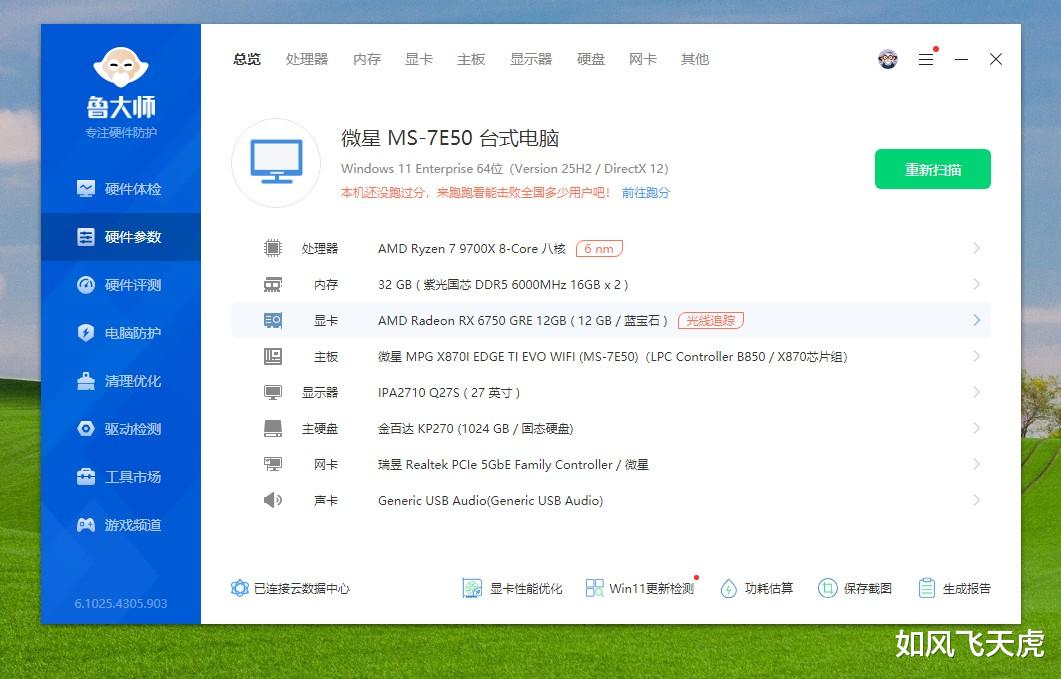 运行鲁大师看看电脑的配置,AMD R7 9700X,32GB DDR5内存 6000MHz C28,显卡是蓝宝石的RX 6750 GRE 12GB极地版,主板是微星的MPG X870I EDGE TI EVO刀锋钛。