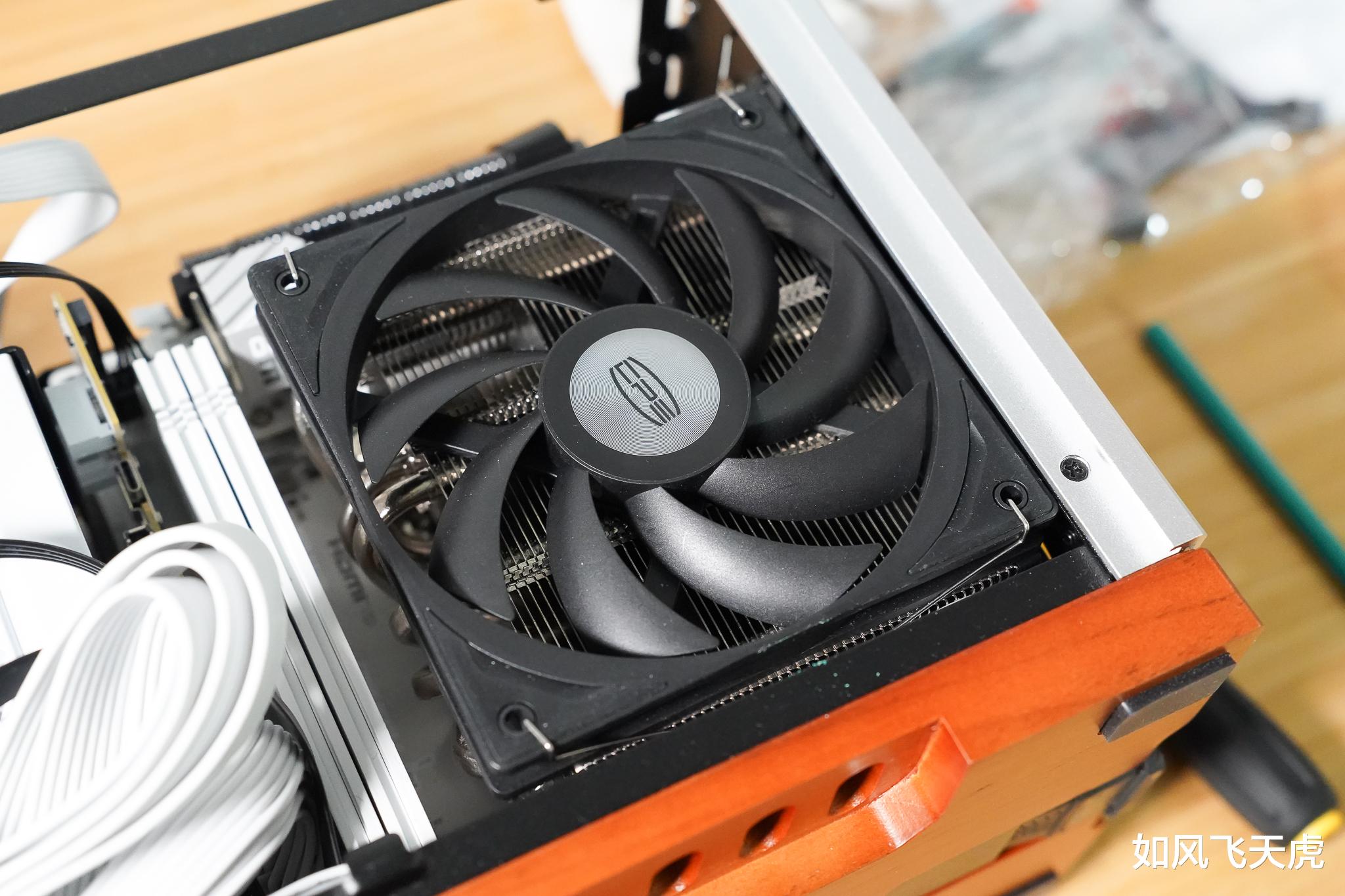 CPU用的事超频三降龙 RC600-67 下压式风冷,以紧凑的120×120×67.5mm体积,完美适配空间有限的ITX机箱,是小体积主机的理想之选。散热塔体采用镀镍工艺处理,兼具耐腐蚀性与高颜值。塔内搭载6根6mm高导热效能热管,通过回流焊技术与鳍片紧密连接,确保热量快速传导。热管双层排布设计,有效提升导热均匀性,避免局部过热。散热鳍片共47片,采用扣Fin+折Fin复合工艺,大幅提升散热面积与结构强度,鳍片边缘均经过精细打磨,有效降低风噪,兼顾性能与静音。上层配备超频三自研F5 R12015白色高性能风扇,静音高效,为整套风冷系统提供强劲风压与稳定气流,让小机箱也能冷静运行。