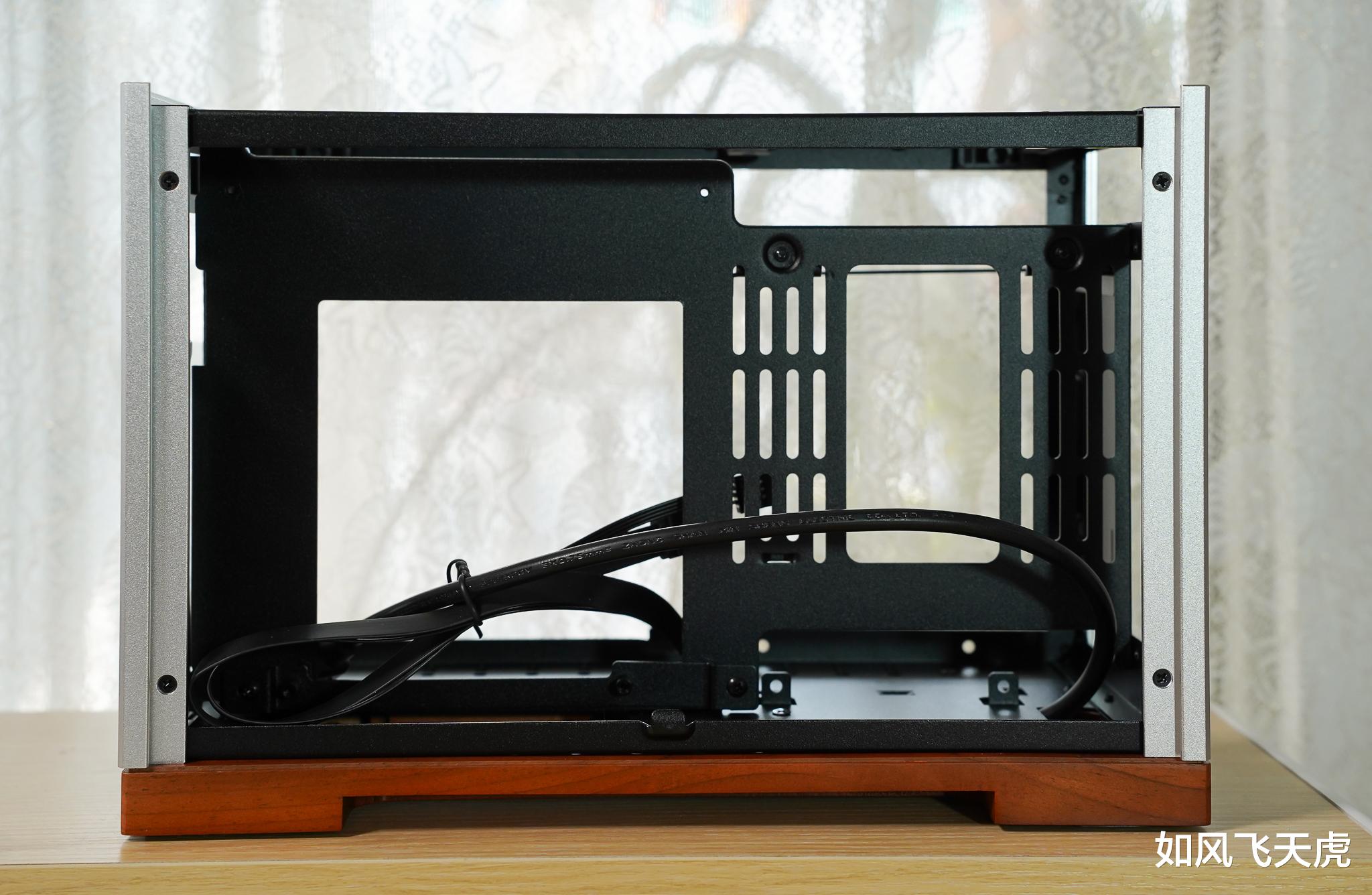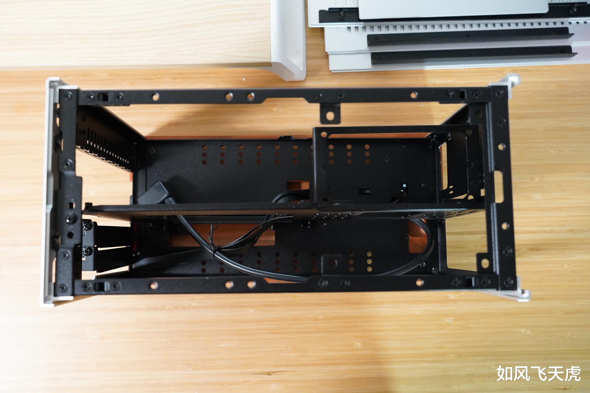 拆完之后的顶视角,中间是隔档,电源线在木质底座里穿过。中间的横档是可以移动位置的,有三档位置,对应着显卡的不同厚度槽位。同样的,位置不同意味着支持的下压式散热器高度不同,三槽位显卡时高度≤58mm,2.5槽位时高度≤68mm,2槽位时高度≤78mm。
