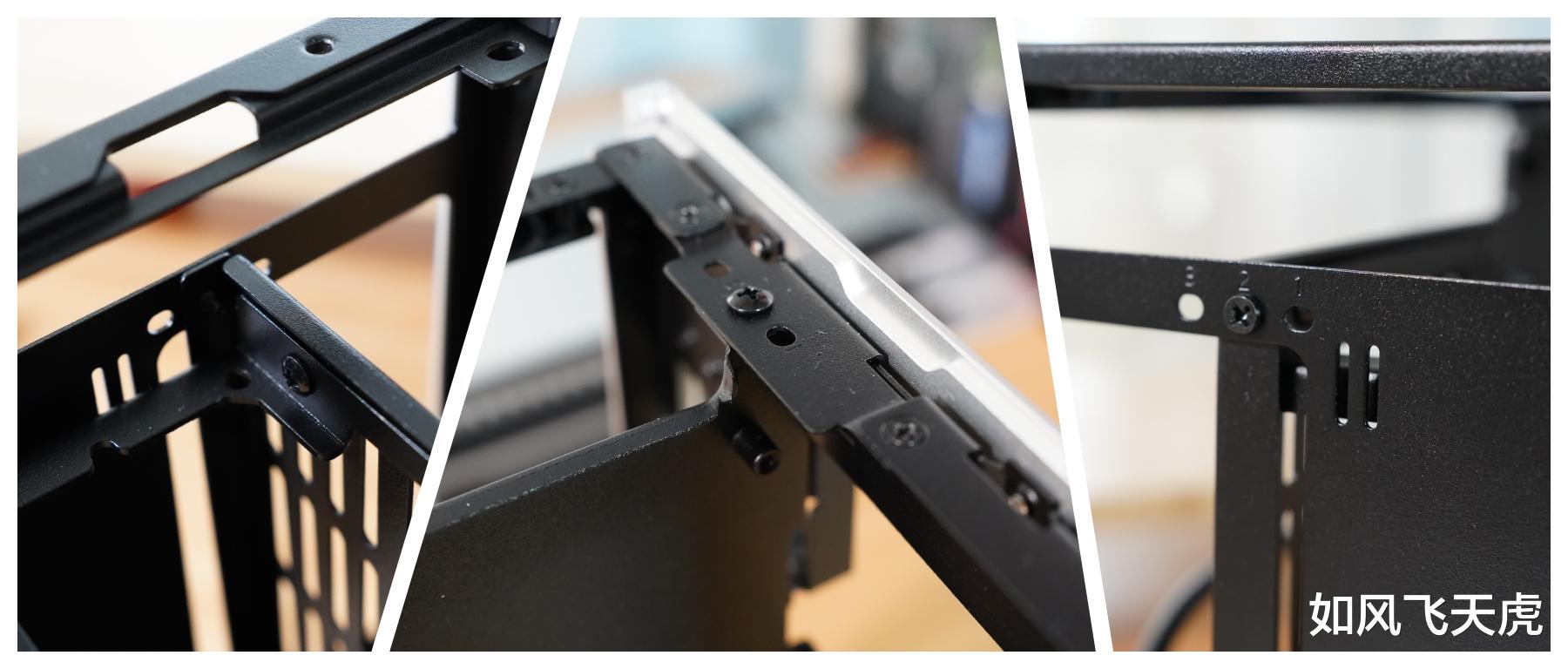 从后面看,底部是电源接口的位置,一侧是IO面板的,另外一侧则是挡板,有2个。不用担心如何支持3槽位显卡,它是可变位置的,具有3档位置可以调节,分别使用2槽、2.5槽和3槽显卡。