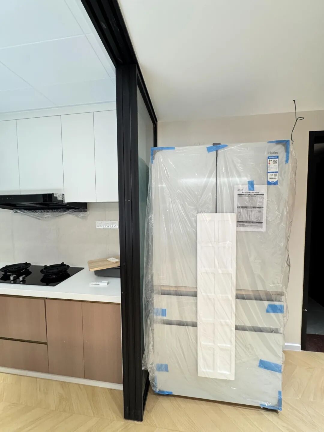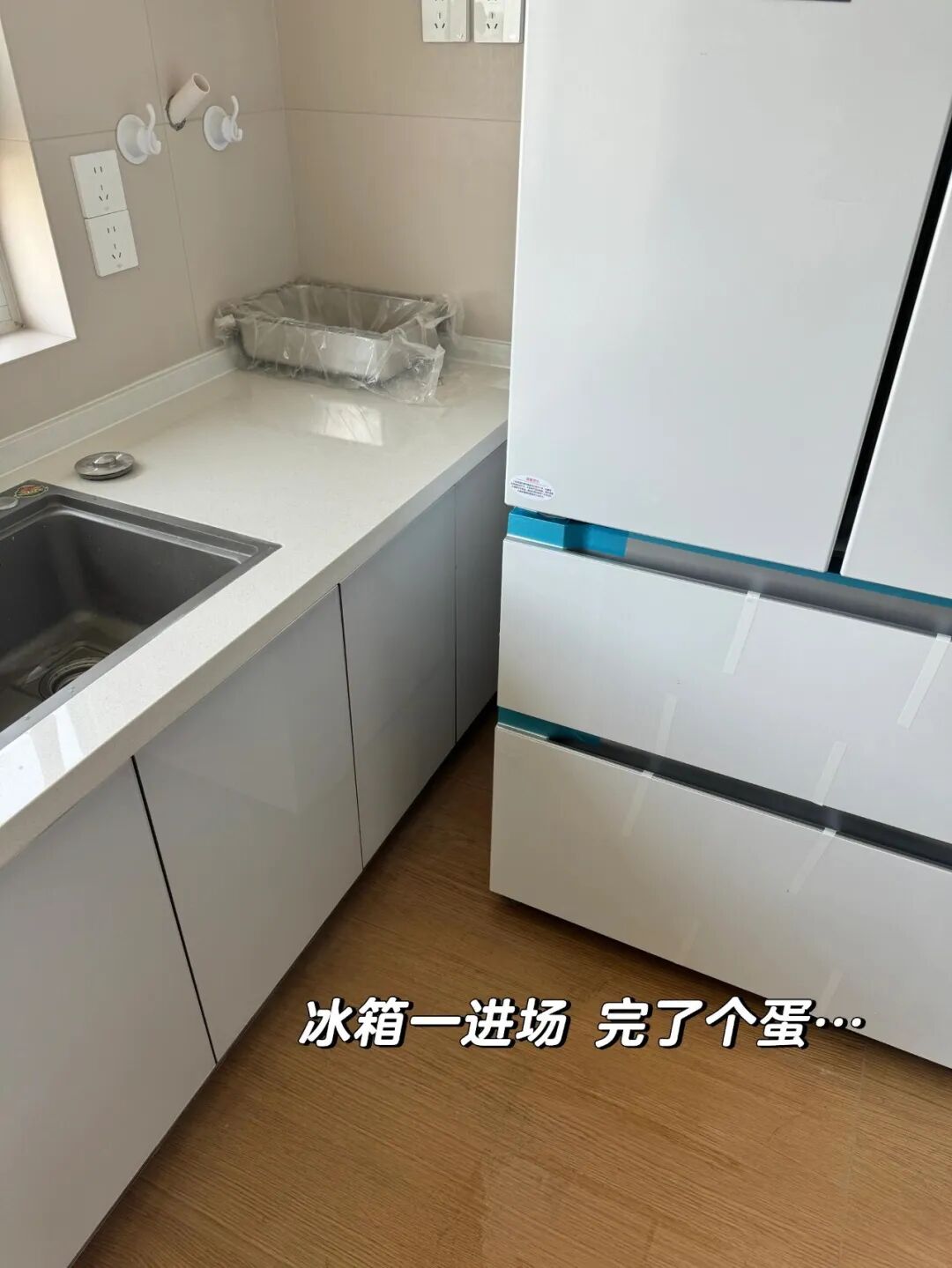 我家刚开始就是这样,厨房太小,冰箱进场之前完全没想到放 下会这么丑,一个大冰箱堵在厨房门口,搞得只能一人进出。