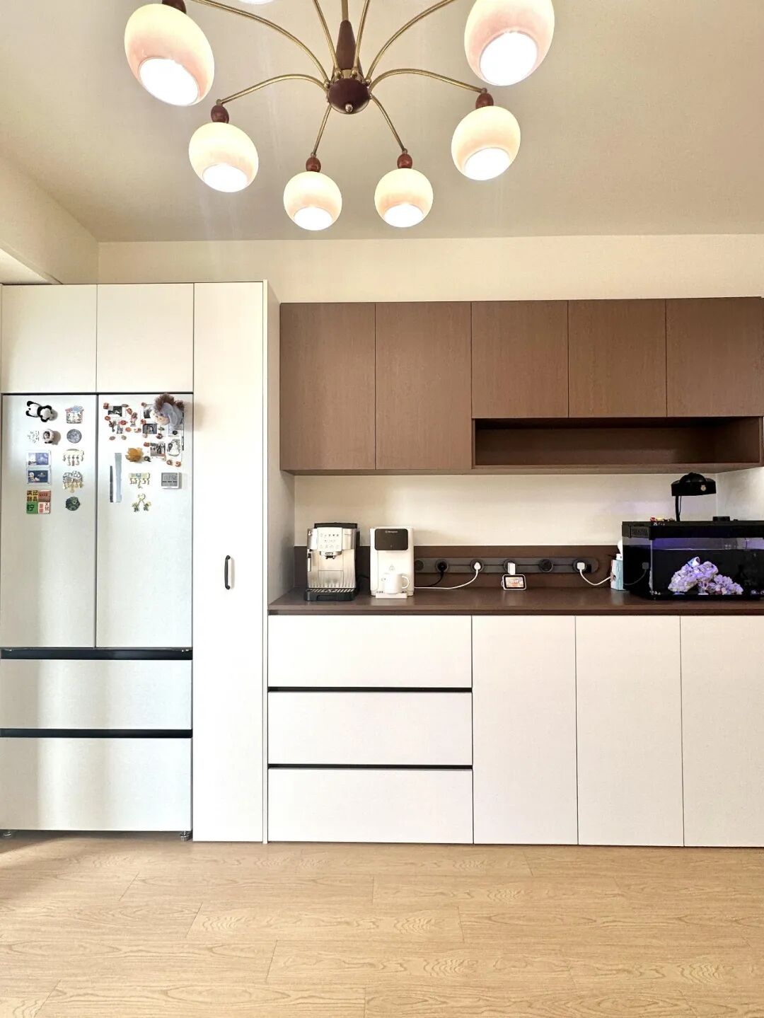 网友@金闪闪 家,把冰箱与餐边柜、水吧台结合在一起,为了与冰箱齐平,做的60cm深的餐边柜,吊柜内收,餐边柜台面所有的小家电都能放得下,这样冰箱严丝合缝,简单美观,视觉上也不显突兀。