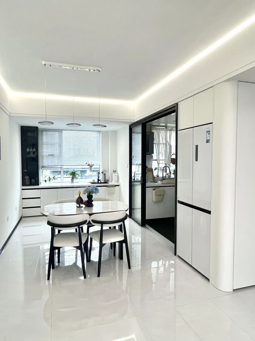 网友@洋仔的窝 家就是这样,他家厨房5平米,橱柜做完没有空间放冰箱了,于是把厨房的墙砸了,做了通顶玄关柜和转角冰箱柜,把双开门冰箱嵌进去,落地效果美观大气,使用也方便。