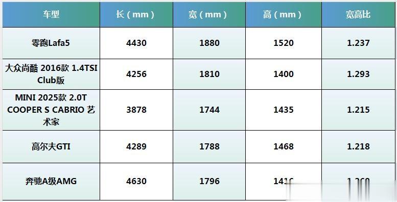 再加上它只有1520mm的车高,宽高比直接做到1.237。这是什么概念?我们再拉几个经典性能车对比一下: