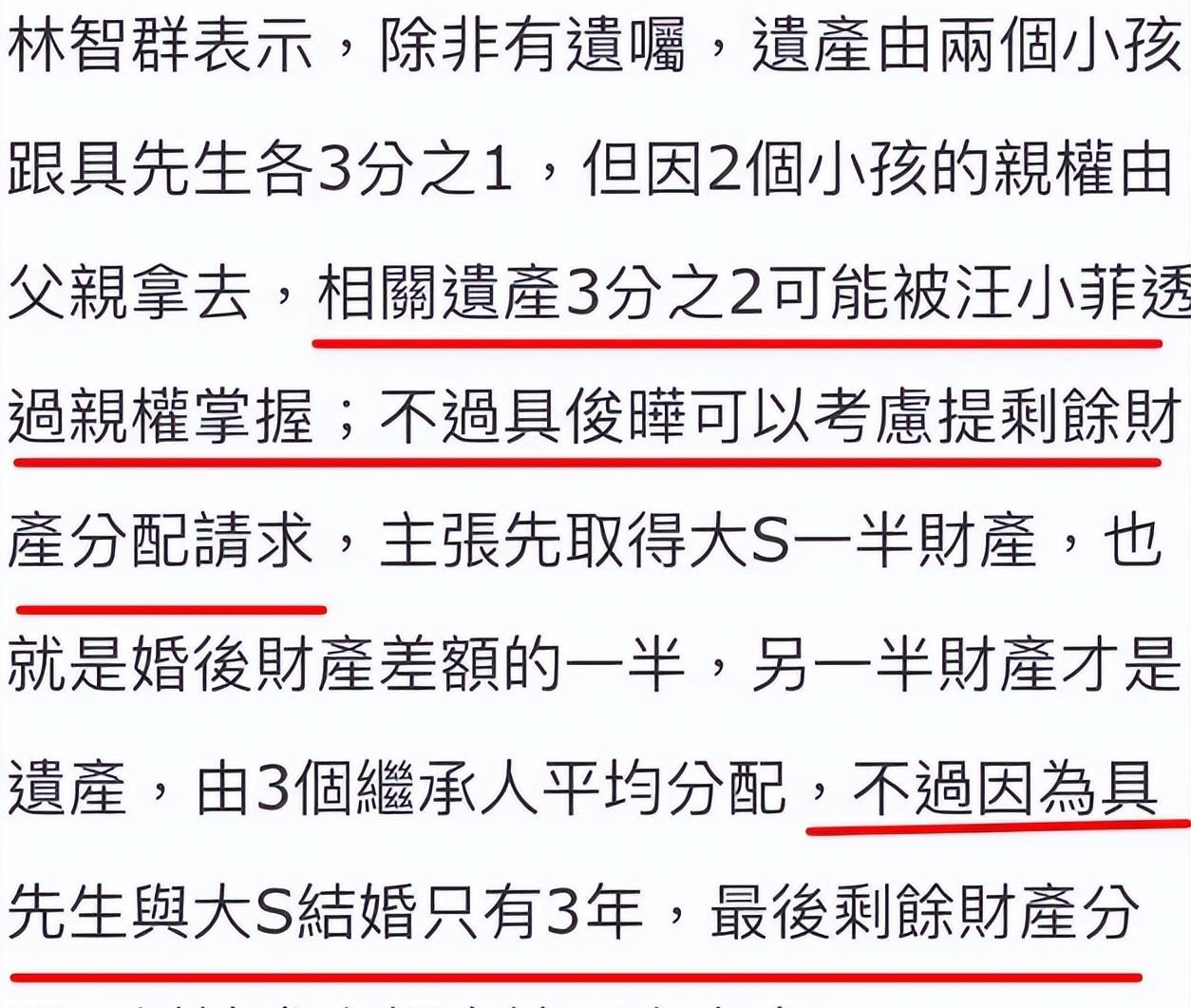 听说大S的资产分配已经搞定了,两个孩子和具俊晔各自分得三分之一。