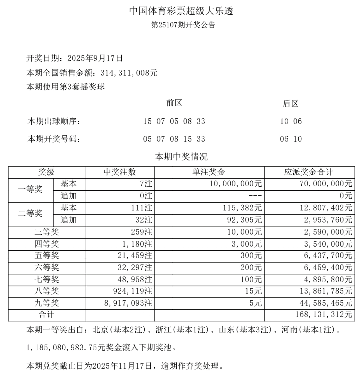 大乐透第25107期开奖公布:一等奖开7注,山东彩友喜获3000万元