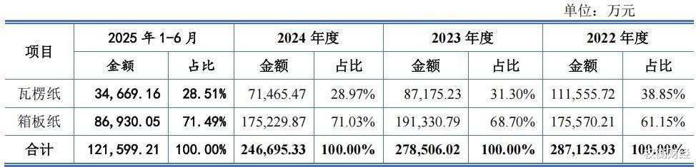 报告期内,公司主营业务收入全部来自于瓦楞纸和箱板纸产品,瓦楞纸收入占比分别为38.85%、31.30%、28.97%和28.51%;箱板纸收入占比分别为61.15%、68.70%、71.03%和71.49%。