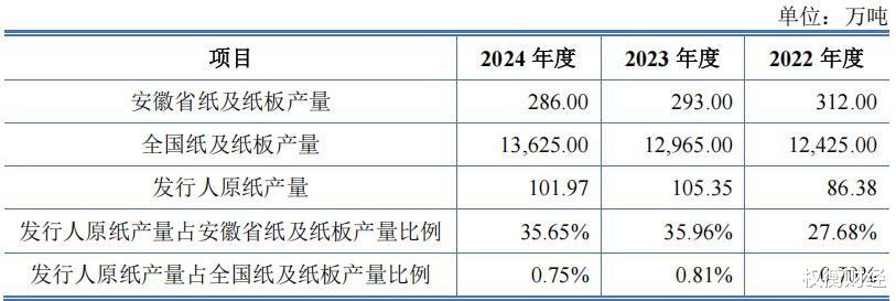 瓦楞纸、箱板纸单位价值较低,运输费用占比较大,存在一定的经济销售半径。公司在安徽、江苏地区的销售收入占销售总额比例较高,区域性特征明显。2022年-2024年,公司原纸产量占安徽省纸及纸板产量比例分别为27.68%、35.96%和35.65%,占全国纸及纸板产量比例分别为0.7%、0.81%和0.75%。