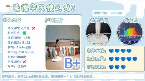 爱德华天使之光2刚开始价格在4000+以上,自发布以来一直降价,目前价格在3000+左右,不过这款护眼台灯在光源设计以及性能配置上的表现不错,是一款搭载NIR技术 补全有益护眼红光的护眼台灯,让光线接近自然光线,做到有效缓解视觉疲劳,不过在抑制蓝光方面上还有带提升,实际蓝光峰值仍然接近1.0,处于一个比较危险的边缘。
