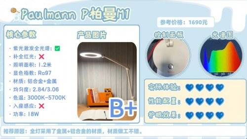 Paulmann P柏曼M1是市面上千元价位以上比较热门的台灯,外观比较简约但是比较有质感,全灯采用了金属+铝合金的材质,同时这款护眼灯具备黄黑两个颜色可以选择,环形的发光面经过折射有效的减少重影,光源上采用全光谱搭载紫光激发全光谱技术,不过比较遗憾的是,蓝光依然在0.9峰值。