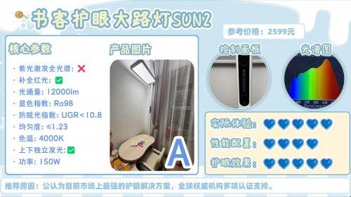 首选是性价比首选书客SUN2护眼大路灯,性能配置可直接媲美中高端护眼灯,且具备良好的护眼性;