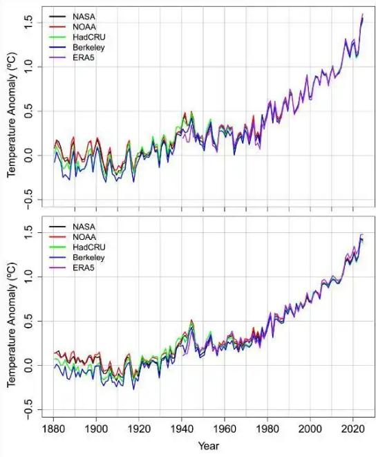 两位研究者拿到NASA、NOAA、HadCRUT、伯克利地球、ERA5这五套全球温度数据,逐一剔除厄尔尼诺、火山喷发和太阳周期的短期影响,只留下长期趋势信号。