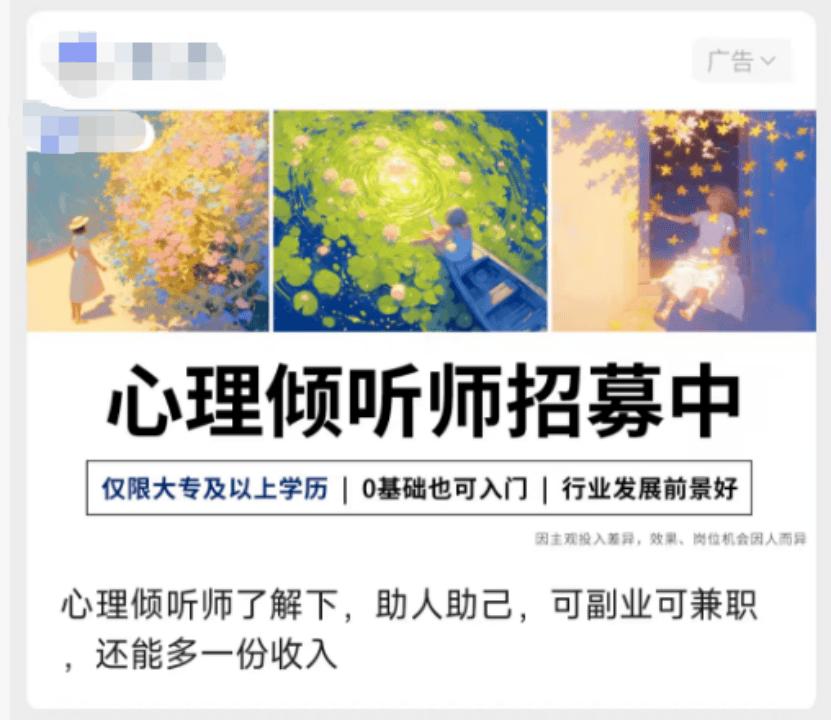 近几年里,很多心理机构开始不断增加了聊愈师、倾听师的职位招聘工作。并在宣传中持续释放“打工族副业”“灵活自由就业”“0门槛入门”“非科班友好”等信息。