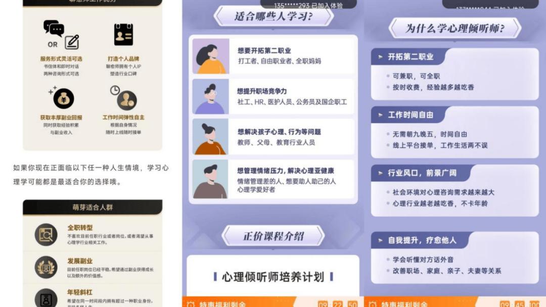 唐欣在K机构入驻失败后,尝试入驻了S倾听平台,虽然这个平台入驻门槛不高,但后续会高频给她推荐各种心理咨询学习课程。