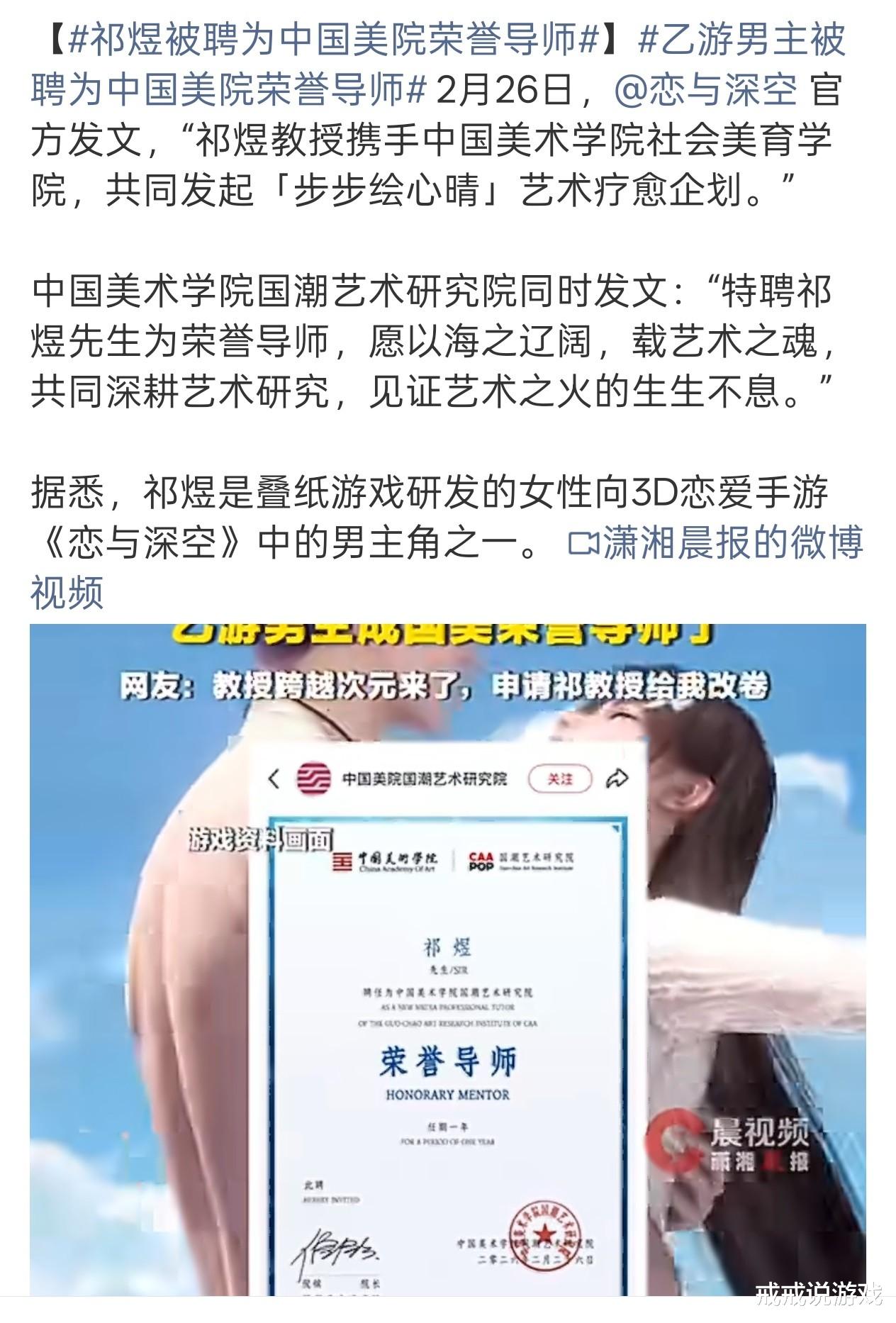 当你看到标题是“祁煜受聘中国美院荣誉导师”这样一则消息的时候,脑海里的第一印象一定是哪个大佬又出名了。让人意外的是,就在昨天,中国美术学院国潮艺术研究院正式官宣,聘任热门手游《恋与深空》中的人气角色祁煜担任荣誉导师!没错,这次的荣誉导师不是真人,而是游戏男主是个纸片人。好家伙,这下是真破次元壁了,纸片人出息了,也是吃上了国家饭!