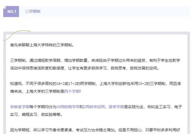 而率先引进“三学期制”的上海大学,现在采用10+2的三学期制,准确来说,上海大学的三学期制是四个学期。春秋冬学期每个学期均分为10周的教学周和2周的考试周,夏季学期是实践为主,例如金工实习,电子实习,编程实习,做实验等等。